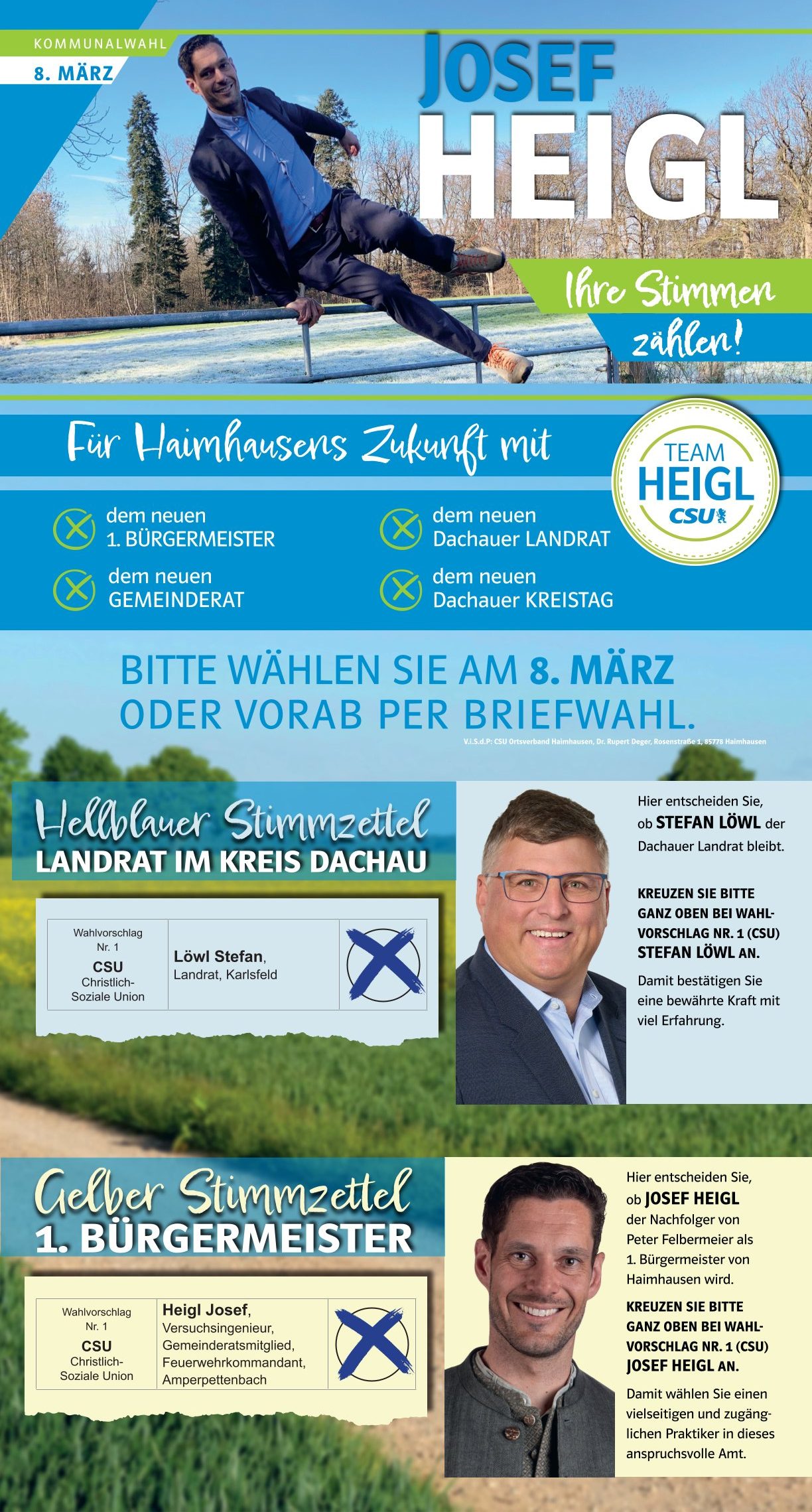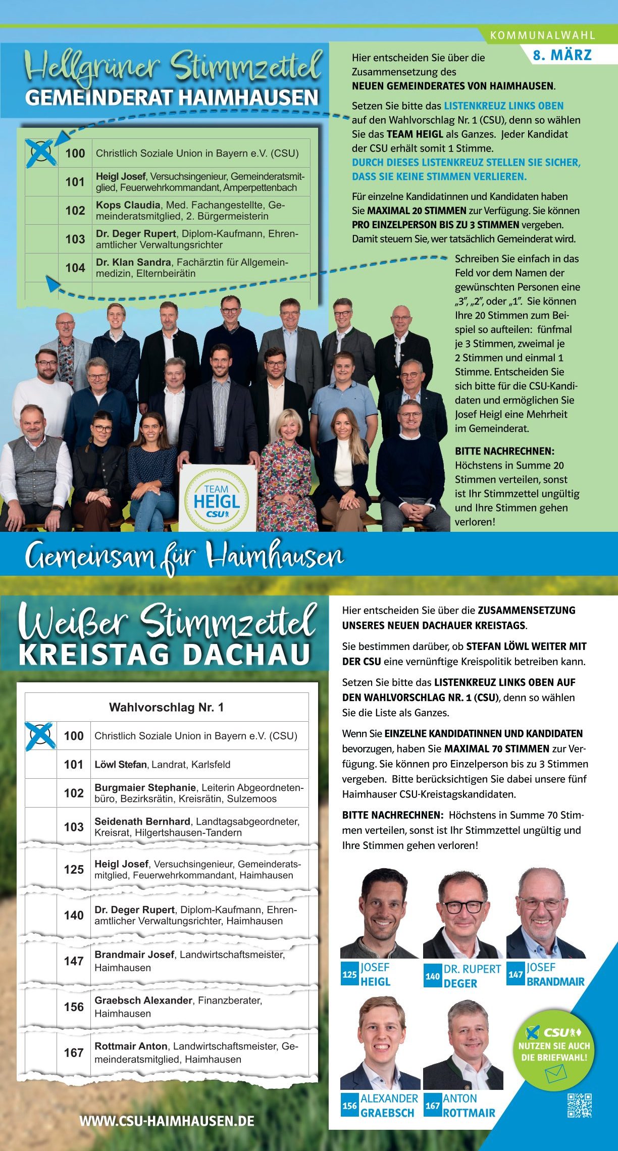 Die Kommunalwahl setzt sich aus vier Wahlen zusammen: Bürgermeister, Landrat, Gemeinderat, Kreistag. Alle sind wichtig! Die Kandidatinnen und Kandidaten der CSU finden Sie jeweils auf Wahlvorschlag Nr. 1. Wir bitten um Ihr Vertrauen und Ihre Stimmen.