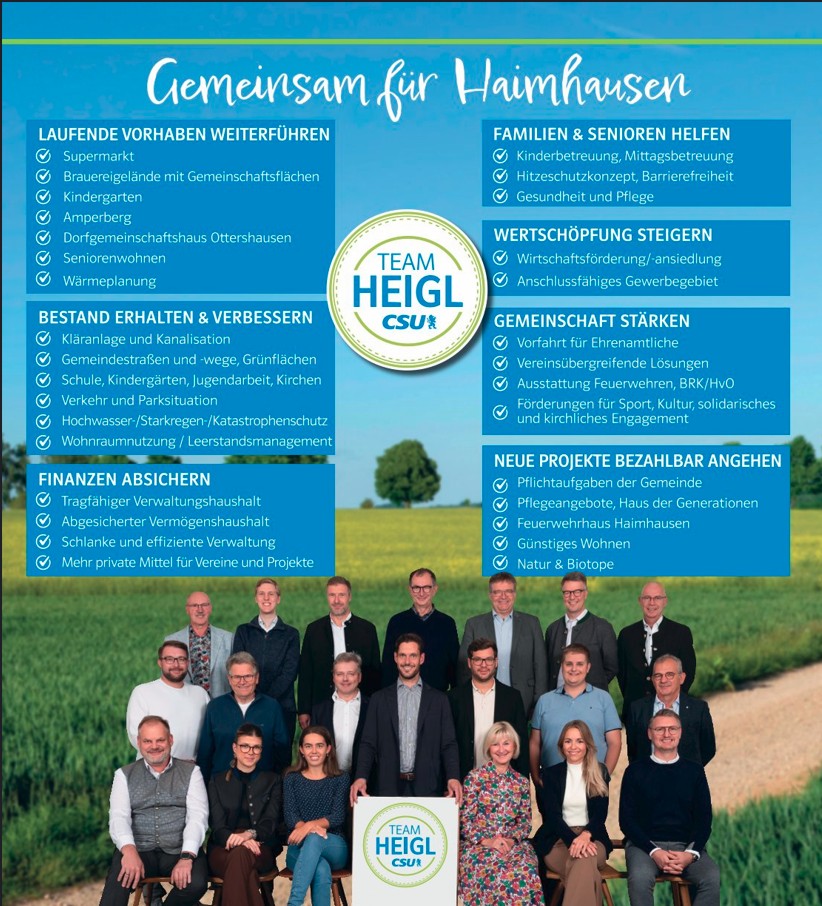 Hier finden Sie unser Wahlprogramm, für das wir als Team geschlossen stehen und mit dem wir Haimhausen verantwortungsvoll und zukunftsorientiert voranbringen wollen.